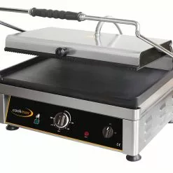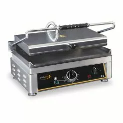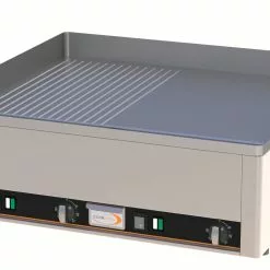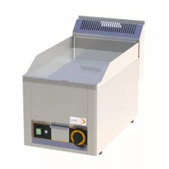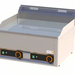 > Edelstahlkorpus > mit Fettauffangschublade > Bratfläche aus 10 mm Stahl, 650 x 480 mm > geschützt vor thermischen Schwankungen > Aufkantung an 3 Seiten > Temperaturbereich: 50°C bis 300°C