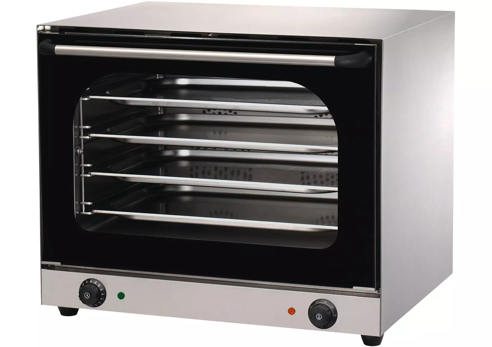 > Außenmaterial Edelstahl > Tür aus hitzebeständigem Glas > Temperaturbereich 50°C bis 300°C > mechanisches Thermostat > mit manuellem Timer > mit Innenbeleuchtung > Abstand Einschübe: 60 mm > inkl. 3 Bleche GN 1/1