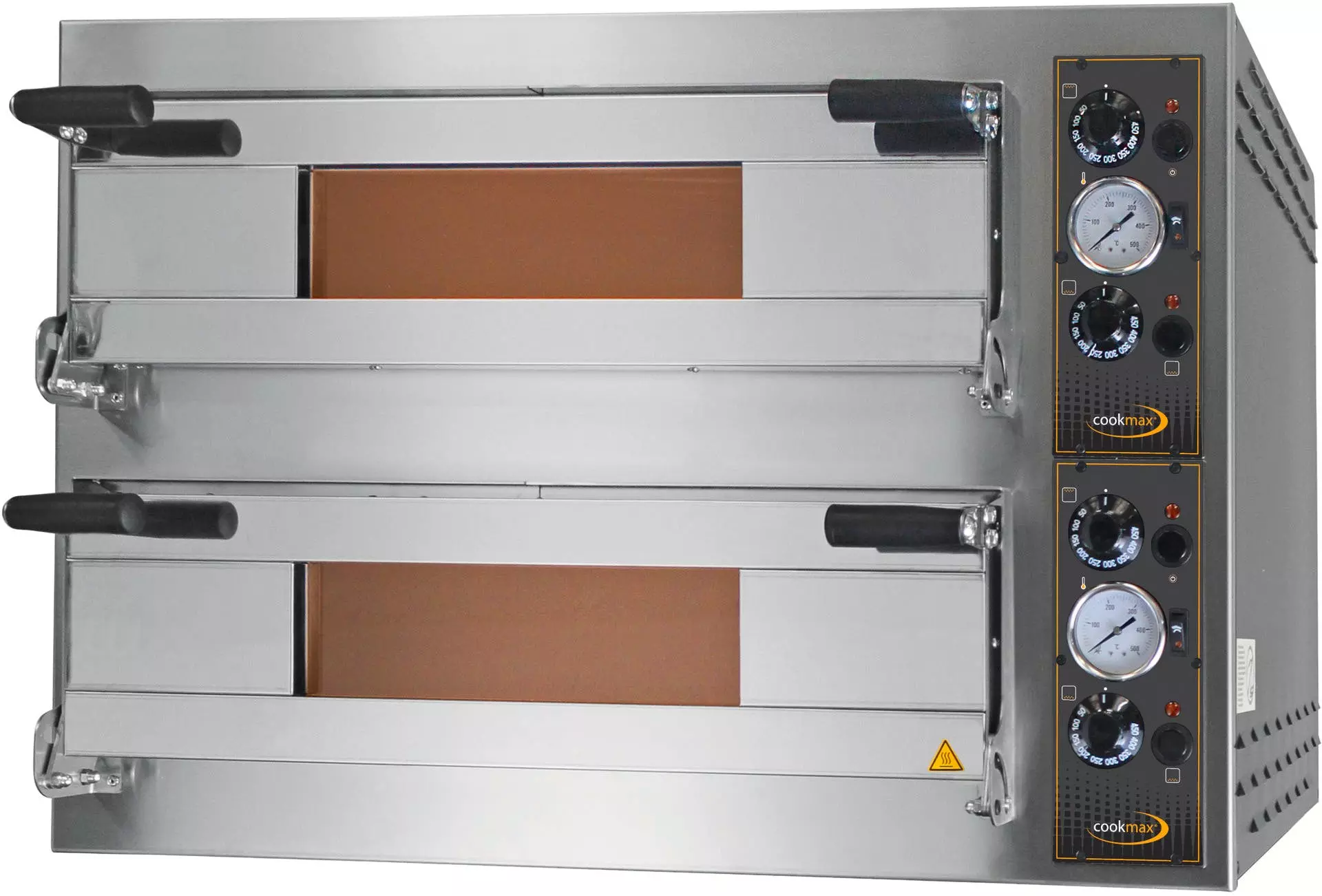 > Innenmaß: 2 x 700 x 700 x 130 mm > Front aus Edelstahl > Korpus schwarz lackiert > Ober- und Unterhitze getrennt regelbar > 2 mechanische Thermostate pro Backkammer > analoge Temperaturanzeige > Backfläche aus Schamottstein > mit Innenbeleuchtung
