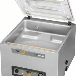 > 8 m³/h Busch Vakuumpumpe > Vakuum-Sensorsteuerung > Kammer aus Edelstahl 350 x 370 x 150 mm > max. Beutelgröße 330 x 450 mm > Schweißbalkenlänge 350 mm > Doppelschweißung > Zyklusdauer 20 – 45 Sekunden > benötigt glatte Beutel > inkl. 1 Einlegeplatte