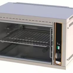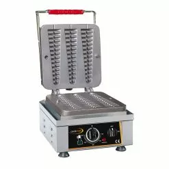 > Backplatten in Gusseisen, teflonbeschichtet > 2 Waffeln á 105 x 165 x 28 mm > Edelstahlkorpus > Temperatur stufenlos regelbar, 50°C bis 300°C > mit Kontrollleuchte, Ein- / Ausschalter > mit Fettauffangschale > Aufheizzeit: 10 – 15 min.
