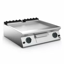 Gastro-Inox 700 “High Performance” Gas-Grillplatte. Die Grillplatte sind für Erdgas geeignet. Die Grillplatte sind in verschiedenen Oberflächenausführungen erhältlich, d.h. Edelstahl, Edelstahl und verchromt, aber auch glatt, komplett gerippt oder 2/3 glatt und 1/3 gerippt. Alle Grillplatte haben eine kurze Aufheizzeit, Piezozündung, eingebaute Auffangwanne, thermostatisch pro Zone einstellbar, thermostatisches Sicherheitsventil und sind leicht zu reinigen