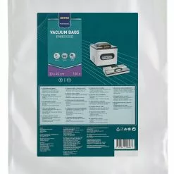 Die Vakuumierbeutel von METRO Professional haben die Maße (B x L): 30 x 40 cm und eine Dicke von 100 µm (geprägte Seite) / 90 µm (glatte Seite). Jede Verpackungseinheit besteht aus 100 Beuteln. Das Produkt ist bis zu 100°C (bei einer Dauer von max. 4 h) hitzebeständig und hält Temperaturen von -40°C stand. Für alle Vakuumiergeräre geeignet. Auch für Schockfroster (-40°C) geeignet . Für die Langzeitkonservierung. Hergestellt aus Polyamid (PA) und Polyethylen (PE).