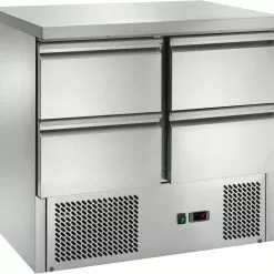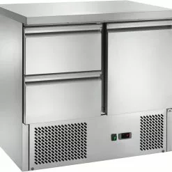 > Temperaturbereich: 2°C bis 8°C > Arbeitsfläche aus Edelstahl 18/10 > 1 Tragerost, 2 Auflageschienen pro Tür > Schublade: 300 x 520 x 140 mm > max. nutzbare Höhe: 150 mm > statische Kühlung mit Ventilator > innen und außen: Edelstahl > eingeschäumter Verdampfer > digitale Steuerung > automatische Abtauung > Kühlmittel R290 > Isolierung: 40 mm