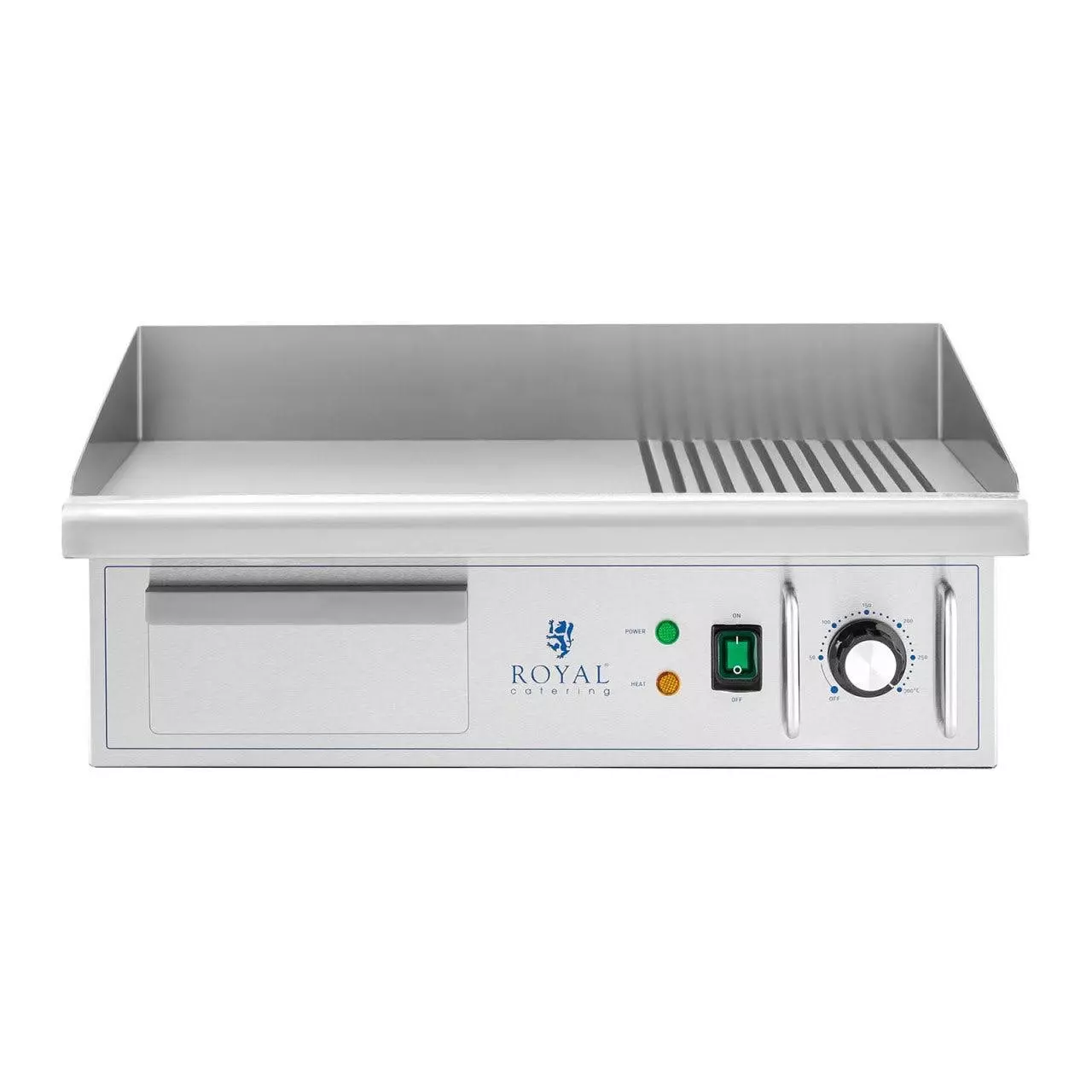 Mit der Elektro Grillplatte RCPG47-M aus dem Gastronomiebedarf von Royal Catering können Sie Ihre Gäste das ganze Jahr über mit leckeren und herzhaften Grillspezialitäten verwöhnen. Ob saftige Steaks und Burger, Fisch, Omeletts, Tortillas oder Gemüse – mit diesem Elektrogrill sind Ihrer Fantasie keine Grenzen gesetzt. Der Grill besticht durch geringe Rauchentwicklung sowie durch eine hygienische und sehr saubere Arbeitsweise. Außerdem eignet sich der Gastronomie-Grill erstklassig für den Einsatz in Großküchen – von Restaurants und Imbissen bis hin zu Foodtrucks oder Catering-Veranstaltungen.