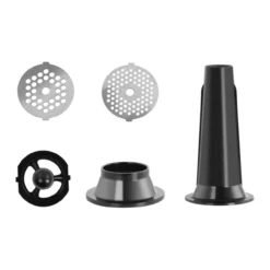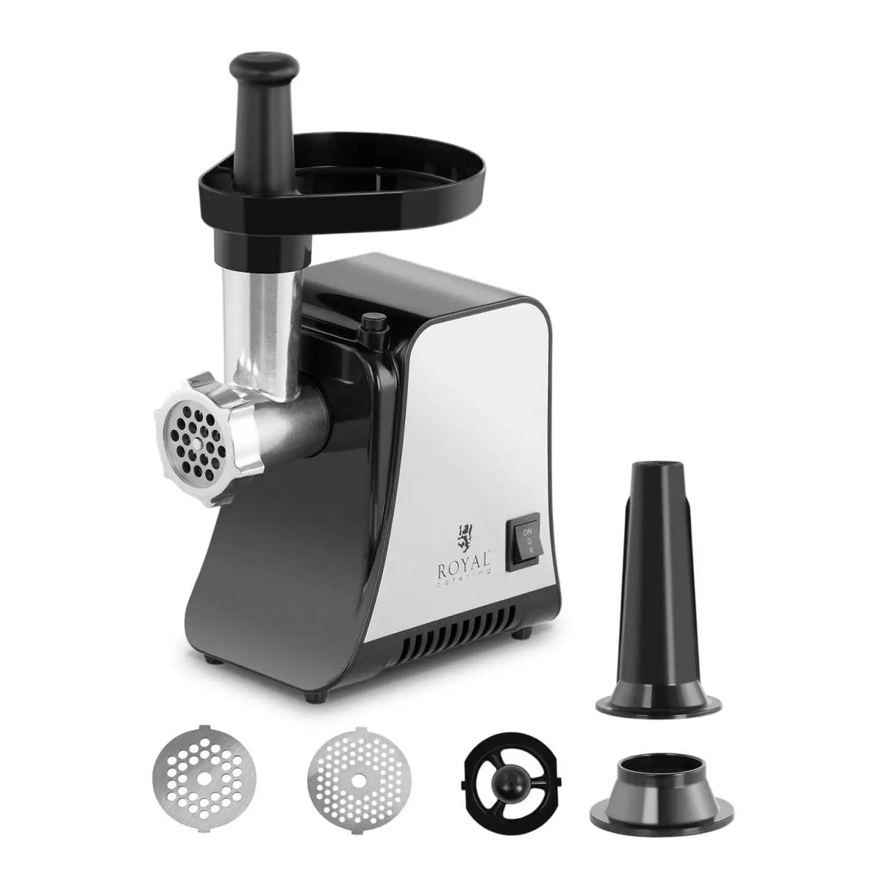 Fleischwolf – Rücklauf – 48 kg/h. Der elegante Fleischwolf verarbeitet Fleisch mit 1.300 W. Der Fleischwolf RCMM-1300W aus dem Fleischereibedarf von Royal Catering ist ein praktisches, leicht bedienbares Gerät für die Lebensmittelverarbeitung. Der Einsatzbereich des Fleischwolfs kann sowohl im privaten als auch im kommerziell-professionellen Gebrauch, wie etwa in Metzgereien oder Restaurants, liegen. Die vielseitige Fleischmaschine aus dem Fleischereibedarf von Royal Catering. Der leistungsstarke 1.300-W-Motor überträgt mühelos die Kraft, die Sie zum Zerkleinern selbst großer Fleischmengen benötigen. Mit einem angemessenen Energieverbrauch kann der Fleischwolf bis zu 48 kg Lebensmittel pro Stunde verarbeiten. Der elektrische Fleischwolf aus dem Gastronomiebedarf von Royal Catering zeichnet sich durch seine hohe Langlebigkeit und eine besonders hochwertige Verarbeitung aus. Das Gehäuse und die Bauteile aus Edelstahl sowie Kunststoff sind deutlich stabiler als diejenigen vergleichbarer Modelle. Das Zubehör eignet sich für die vielseitige Herstellung Ihrer eigenen Hamburger, Wurstwaren und sonstiger Fleischprodukte, aber auch für eine Vielzahl anderer Lebensmittel wie Tomaten, Nudeln, Chilischoten oder getrockneten Früchte. Die große Fleischablage und der Kunststoffschieber erleichtern Ihnen das Arbeiten. Sie können die Nahrung sicher in den Einschub pressen. Die Herstellung von Würsten aus dem verarbeiteten Fleisch ist mit dem mitgelieferten Düsenaufsatz kein Problem. Mit jeder Drehung wird das Fleisch effektiv über die Schneckenwelle gegen die scharfe Kreuzklinge geschoben und schließlich durch die Lochscheibe gedrückt. Dabei liefern die Löcher mit einem Durchmesser von 3, 5 oder 7 mm eine gleichmäßig zerhackte Fleischmasse, die sich optimal weiterverarbeiten lässt. Die Fleischmaschine besitzt einen Rücklauf, um beispielsweise festsitzende Essensbestände zu lösen und heraus zu befördern. Bei einer Blockierung muss das Gerät somit nicht zerlegt werden, um das Essen zu entfernen. Die Gummifüße schonen nicht nur empfindliche Oberflächen und geben einen sicheren Stand, sondern mindern die während des Betriebs entstehenden Vibrationen. Dadurch wir ein bequemes Arbeiten sichergestellt.