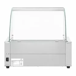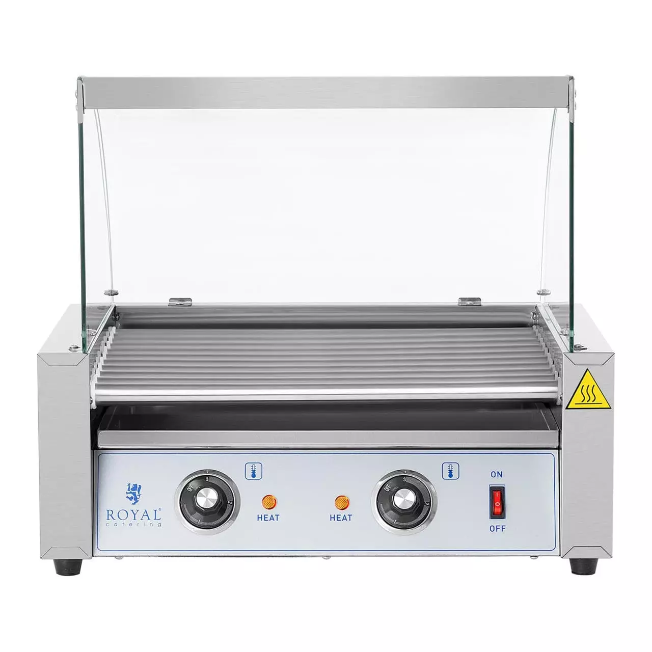 Kompakter Hot Dog Grill aus Edelstahl mit 11 RollenMit dem kompakten Hot Dog Grill RC-HTR11WC von Royal Catering wird das Braten und Warmhalten von Würstchen aller Art zum Kinderspiel. Dank seiner robusten Konstruktion und hochwertigen Komponenten ist der Hot Dog Maker speziell für den professionellen Einsatz in Gastronomiebetrieben wie Imbissen, Restaurants oder Tankstellen geeignet. Der RC-HTR11WC ermöglicht durch seine 11 leistungsstarken Heizstäbe eine schnelle und effiziente Zubereitung von bis zu 20 Hotdog-Würstchen. Die mit Edelstahl beschichteten Rollen rotieren automatisch um 360°, sodass jedes Würstchen gleichmäßig aufgeheizt wird. Die Temperatur lässt sich variabel von 0 – 230 °C einstellen. Die beiden Heizzonen der Hot Dog Maschine befinden sich in den vorderen und hinteren Rollen. Sie werden von separaten Thermostaten geregelt, sodass Sie gleichzeitig Würstchen braten und warmhalten können. Unter den Rollen befindet sich eine Auffangschublade, mithilfe derer das überschüssige Fett aufgefangen und leicht entsorgt werden kann. über einen Kippschalter wird das Hot Dog Gerät ein- und ausgeschaltet. Mit den handlichen Drehreglern stellen Sie die gewünschte Temperatur ein. Zudem erkennen Sie an den Signalleuchten, ob der Grill die gewünschte Hitze erreicht hat.Technische DetailsLeistung: 1100 WStromkabel: 1,4 mBeschichtung Stab: Edelstahl Material Gehäuse: Edelstahl, gehärtetes GlasTemperaturbereich: 0 – 230 °CSpannung: 230 VAnzahl Heizstäbe: 11Durchmesser Rollen: 25 mmLänge Rollen: 445 mmAbstand zwischen den Rollen: 13 mmAbtropfschaleZwei HeizzonenGlasabdeckungLieferumfangHot Dog Grill RC-HTR11WC, Montagezubehör, Fettauffangschale, Glasabdeckung, Bedienungsanleitung