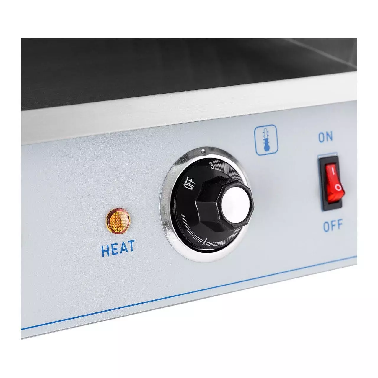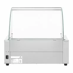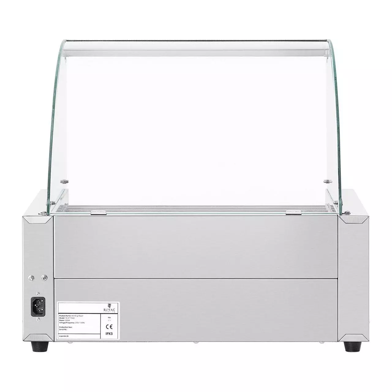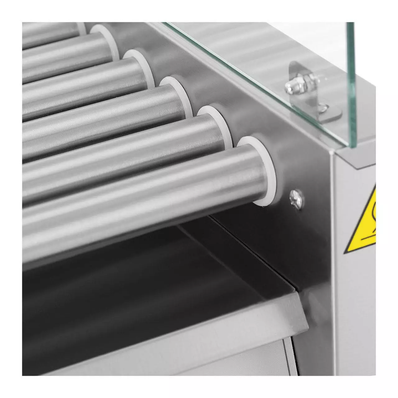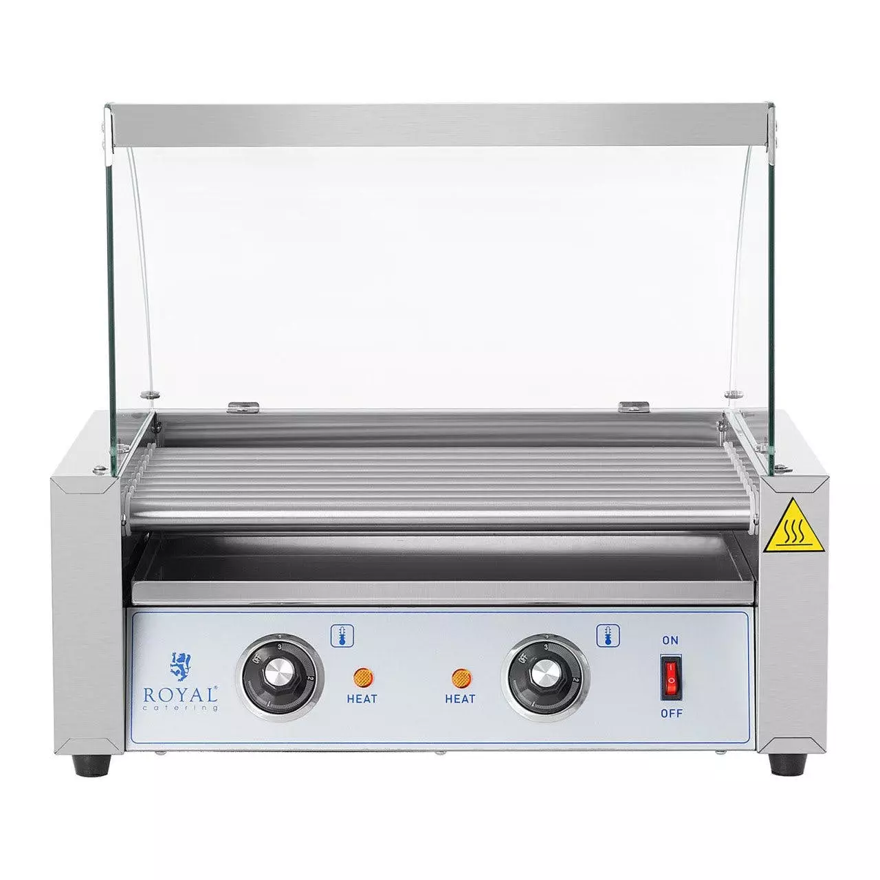 Kompakter Hot Dog Grill aus Edelstahl mit 9 RollenMit dem kompakten Hot Dog Grill RC-HTR9WC von Royal Catering wird das Braten und Warmhalten von Würstchen aller Art zum Kinderspiel. Dank seiner robusten Konstruktion und hochwertigen Komponenten ist der Hot Dog Maker speziell für den professionellen Einsatz in Gastronomiebetrieben wie Imbissen, Restaurants oder Tankstellen geeignet. Der RC-HTR9WC ermöglicht durch seine 9 leistungsstarken Heizstäbe eine schnelle und effiziente Zubereitung von bis zu 16 Hotdog-Würstchen. Die mit Edelstahl beschichteten Rollen rotieren automatisch um 360°, sodass jedes Würstchen gleichmäßig aufgeheizt wird. Die Temperatur lässt sich variabel von 0 – 230 °C einstellen. Die beiden Heizzonen der Hot Dog Maschine befinden sich in den vorderen und hinteren Rollen. Sie werden von separaten Thermostaten geregelt, sodass Sie gleichzeitig Würstchen braten und warmhalten können. Unter den Rollen befindet sich eine Auffangschublade, mithilfe derer das überschüssige Fett aufgefangen und leicht entsorgt werden kann. über einen Kippschalter wird das Hot Dog Gerät ein- und ausgeschaltet. Mit den handlichen Drehreglern stellen Sie die gewünschte Temperatur ein. Zudem erkennen Sie an den Signalleuchten, ob der Grill die gewünschte Hitze erreicht hat.Technische DetailsLeistung: 900 WStromkabel: 1,4 mBeschichtung Stab: Edelstahl Material Gehäuse: Edelstahl Temperaturbereich: 0 – 230 °CSpannung: 230 VAnzahl Heizstäbe: 9Durchmesser Rollen: 25 mmLänge Rollen: 445 mmAbstand zwischen den Rollen: 13 mmAbtropfschaleZwei HeizzonenGlasabdeckungLieferumfangHot Dog Grill RC-HTR9WC, Montagezubehör, Fettauffangschale, Glasabdeckung, Bedienungsanleitung
