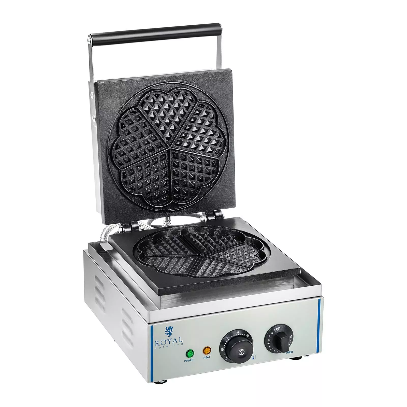 Waffeleisen mit 1.500 Watt – herzförmig Mit dem Waffeleisen RCWM-1500-H aus dem Marktbedarf von Royal Catering holen Sie sich den Duft frisch gebackener Waffeln direkt in Ihr CafĂ© oder Restaurant und verzaubern Ihre GĂ€ste mit knusprigen und goldbraunen Waffeln. Ob in der sĂŒĂen Variante mit Schokolade sowie Beeren oder herzhaft mit frischen KrĂ€utern und Schinken â mit dem Waffeleisen servieren Sie im Handumdrehen delikate und vielfĂ€ltige Waffelvariationen.